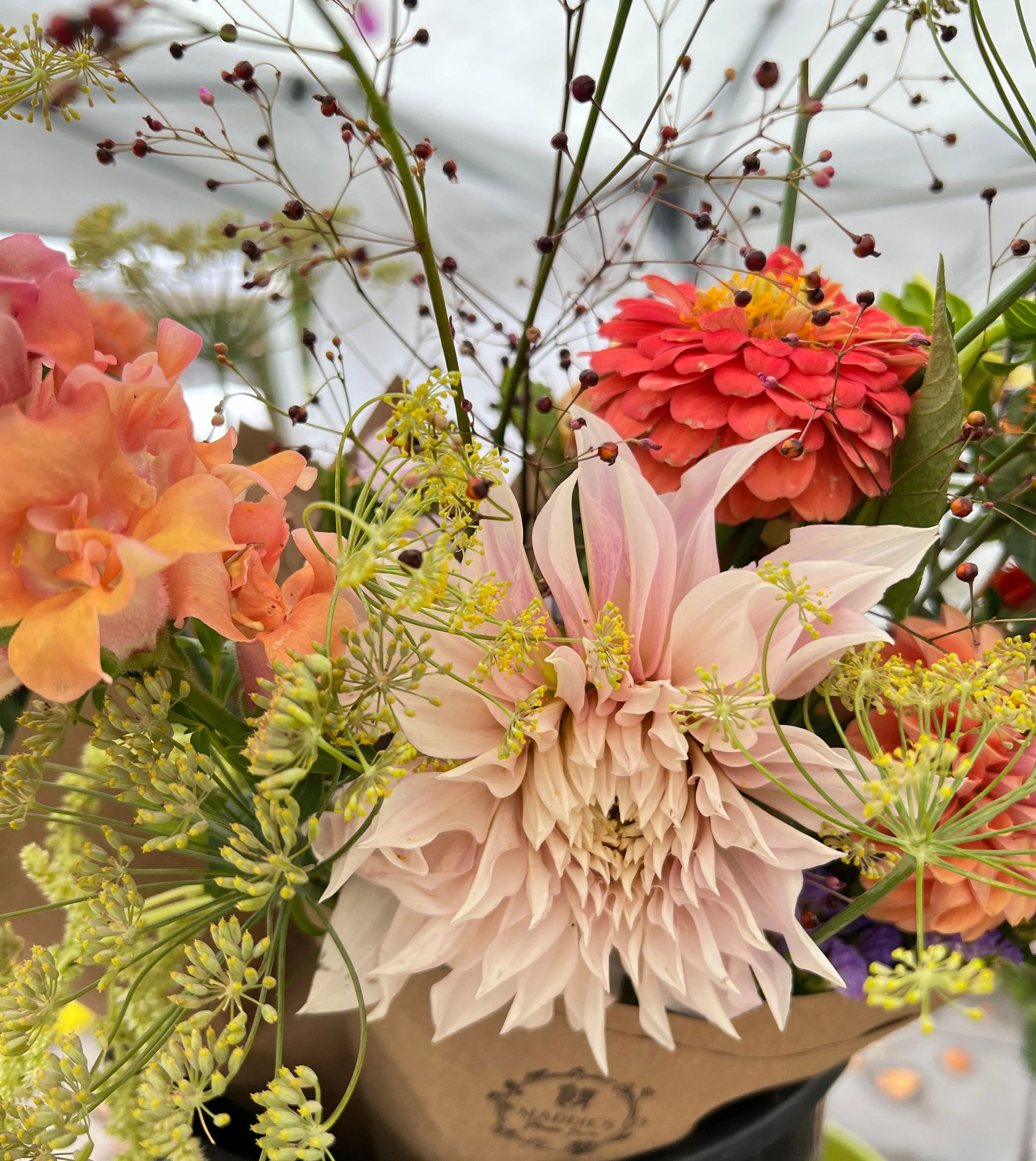 The summer series includes the best of our favorite summer blooms including snapdragons, dahlias, sunflowers, zinnias, fancy marigolds & so many more arranged into our signature, slightly wild bouquets. 6 weeks- $180